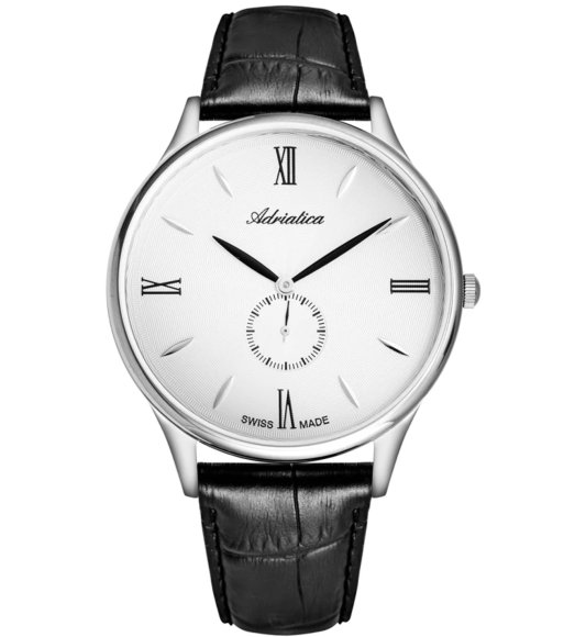 Adriatica Classic A1230.5263QXL – męski zegarek, należący do prestiżowej, szwajcarskiej marki – Adriatica. Elegancki czasomierz ma okrągłą kopertę, wykonaną z wysokogatunkowej stali szlachetnej i czarny pasek, z naturalnej skóry, który stabilnie trzyma się nadgarstka. Jasną tarczę luksusowego zegarka pokrywają czarne wskazówki i indeksy godzinowe, w postaci cyfr rzymskich:III, VI, IX i XII oraz jasnych kresek. Klasyczny czasomierz został wyposażony w mineralne, odporne na uderzenia szkiełko i wodoodporność 30m, która chroni model przed zachlapaniem. Ekskluzywny zegarek na pasku znakomicie prezentuje się zakładany na specjalne okazje, do garnituru i koszuli. Szwajcarski czasomierz to klasa sama w sobie, dlatego idealnie nadaje się do wręczenia na prezent z okazji zdania matury, przejścia na emeryturę, czy np. na Dzień Ojca.