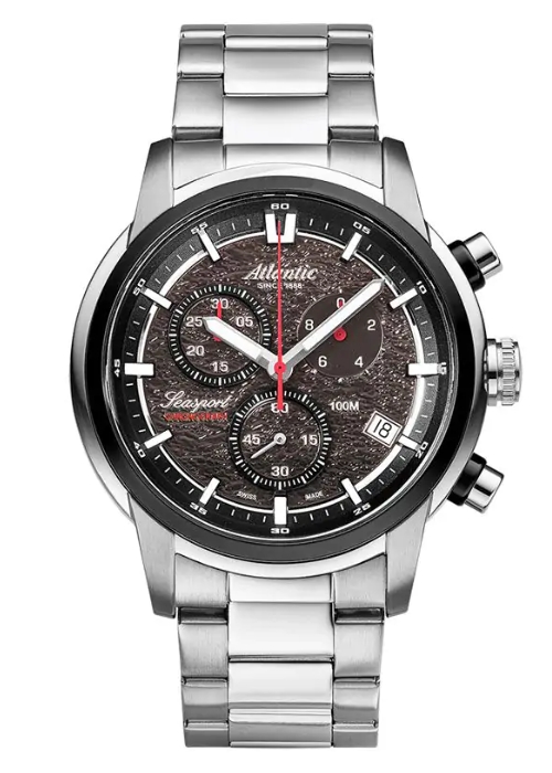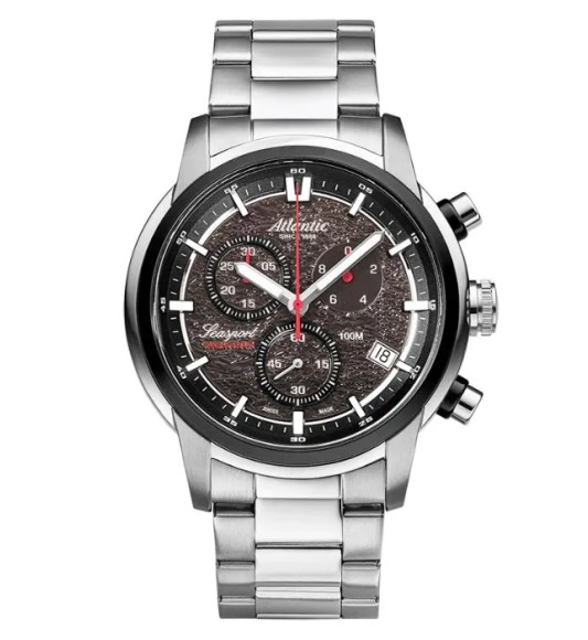 Atlantic Seasport 87466.42.41 to męski zegarek sportowy o wyrazistym, dynamicznym charakterze, łączący szwajcarską precyzję z solidnym wykonaniem. Model posiada dużą stalową kopertę o średnicy 46 mm, czarną tarczę z funkcją chronografu i datownikiem, a całość chroni szafirowe szkło odporne na zarysowania. Mechanizm ETA G10.212 gwarantuje niezawodność i dokładność pomiaru czasu, a wodoszczelność 100 m (WR100) pozwala na bezpieczne użytkowanie podczas pływania czy sportów wodnych. Zegarek wyróżnia się masywną sylwetką, stalową bransoletą i kontrastowymi srebrnymi detalami, dzięki czemu doskonale sprawdza się zarówno w codziennym, jak i aktywnym stylu życia.