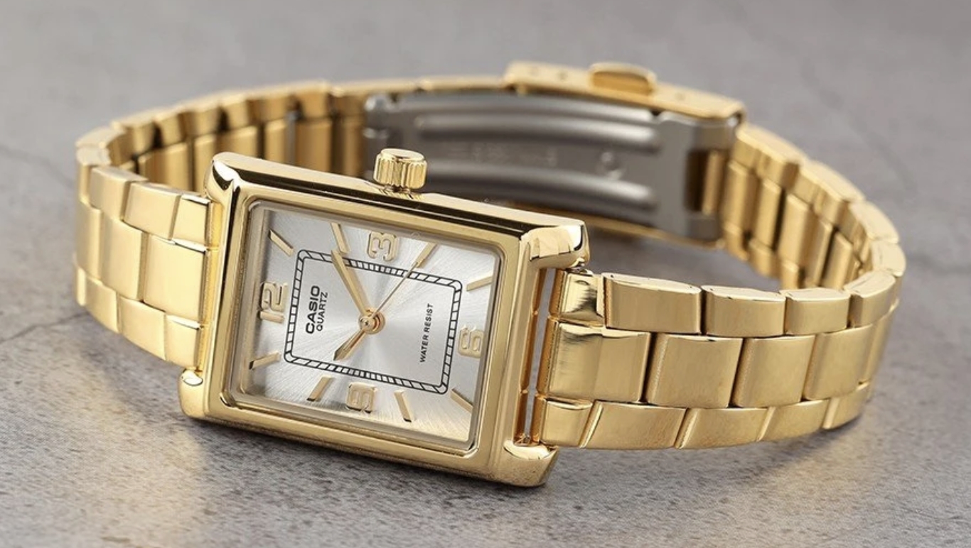 Casio Classic LTP-1234PG-7AEG – elegancki zegarek damski, należący do cieszącej się ogromną popularnością, japońskiej marki – Casio. Klasyczny czasomierz posiada prostokątną kopertę i bransoletkę z ogniw, wykonane z wytrzymałego, pokrytego złoceniem, metalu. Na jasnej tarczy uniwersalnego zegarka, umieszczono strzeliste wskazówki i indeksy godzinowe, w postaci kresek i cyfr arabskich: 3, 6, 9 i 12. Kwarcowy czasomierz marki Casio, został wyposażony w mineralne, odporne na uderzenia szkiełko i wodoodporność 30m, chroniącą model przed zachlapaniem. Przystępna cena idzie tu w parze z doskonałą, japońską precyzją działania.