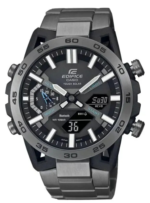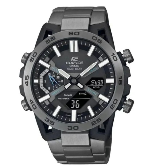 Casio Edifice ECB‑2000DC‑1AEF to zaawansowany zegarek męski z serii Edifice Sospensione, inspirowany konstrukcją zawieszenia bolidów Formuły 1. Łączy sportowy design z technologią Bluetooth® i zasilaniem solarnym Tough Solar
