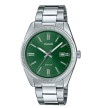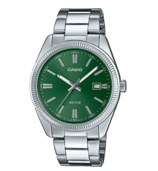 CASIO MTP‑1302PD‑3AVEF to klasyczny męski zegarek, który wyróżnia się elegancką, zieloną tarczą nadającą mu świeżego i nowoczesnego charakteru. Srebrna stalowa bransoleta oraz charakterystyczna karbowana luneta tworzą ponadczasowy, lekko biżuteryjny wygląd.