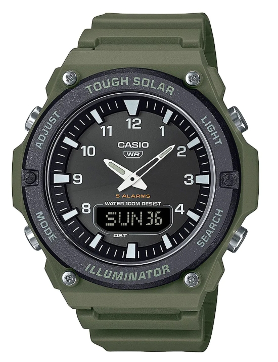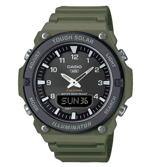 CASIO Sport AQ‑S820W‑3BVEF to solidny, męski zegarek outdoorowy z zasilaniem solarnym, zaprojektowany do codziennego i sportowego użytkowania. Łączy lekką kopertę z tworzywa z wyrazistą, ciemną tarczą i zielonym akcentem, co nadaje mu militarny charakter. Model oferuje praktyczne funkcje – stoper, timer, alarmy, czas światowy, podświetlenie – a dzięki wodoszczelności 100 m sprawdzi się podczas pływania i aktywności w terenie. To niezawodny wybór dla osób, które chcą zegarka trwałego, funkcjonalnego i bezobsługowego dzięki technologii Tough Solar.