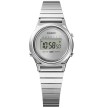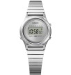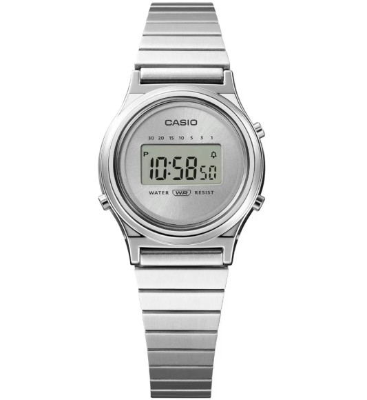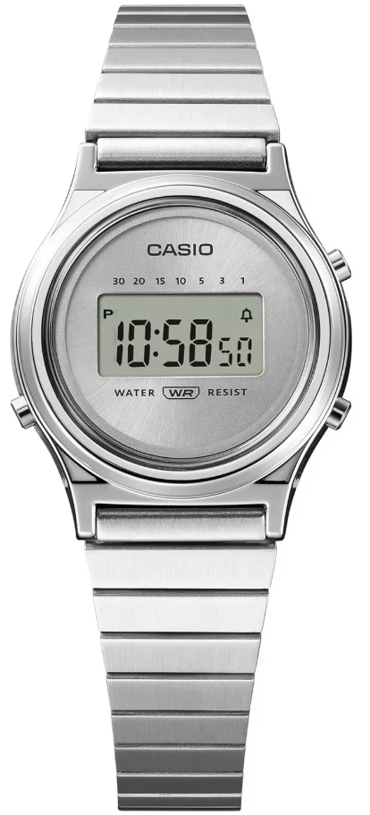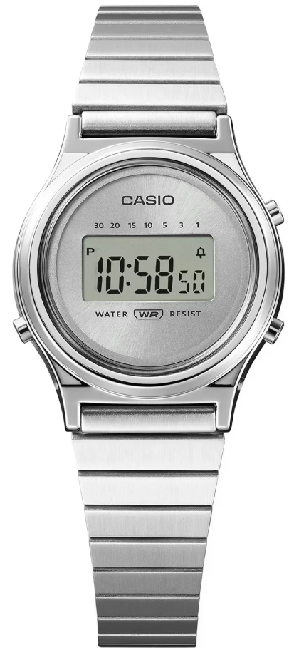 Casio LA700WE-7AEF to damski zegarek cyfrowy z linii Vintage Mini, łączący retro styl z nowoczesną funkcjonalnością. Posiada kompaktową kopertę o średnicy 26 mm i grubości 8 mm, wykonaną z tworzywa sztucznego, oraz srebrną bransoletę ze stali szlachetnej. Zegarek wyposażony jest w mechanizm kwarcowy, cyfrowy wyświetlacz z efektem szlifu słonecznego, datownik oraz alarm. Szkiełko hesalitowe zapewnia lekkość i możliwość polerowania. Wodoszczelność na poziomie 30 m (3 ATM) chroni przed zachlapaniami.