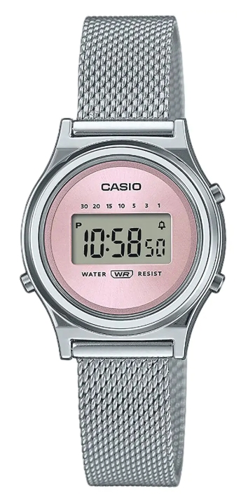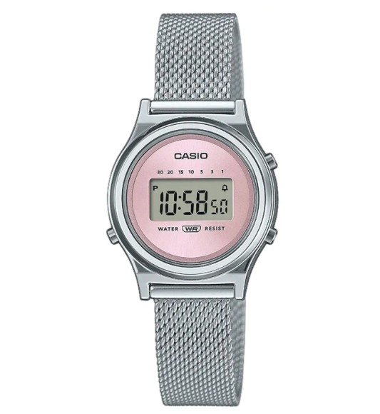 CASIO Vintage LA700WEM-4AEF to subtelny, lekki i wyjątkowo stylowy zegarek utrzymany w klasycznej estetyce retro. Jego minimalistyczna koperta w odcieniu różowego złota oraz elegancka, metalowa bransoleta tworzą ponadczasowy duet, który świetnie uzupełnia codzienne i bardziej eleganckie stylizacje. Model wyposażono w precyzyjny mechanizm kwarcowy, czytelny cyfrowy wyświetlacz oraz podstawowe funkcje, takie jak stoper czy alarm. To idealny wybór dla osób ceniących prostotę, vintage’owy charakter i niezawodność marki Casio.