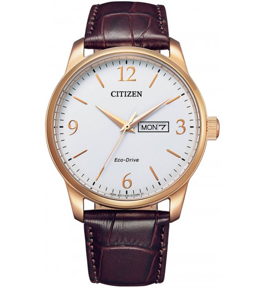 Citizen Eco-Drive BM8553-16AE – to elegancki zegarek męski, należący do znanej i cenionej na świecie, japońskiej marki – Citizen. Ten luksusowy czasomierz posiada mechanizm Eco-drive z autorską funkcją ładowania baterii światłem słonecznym i sztucznym. Okrągła koperta odświętnego zegarka została wykonana z wysokiej jakości stali szlachetnej, w kolorze różowego złota i osadzona na eleganckim, brązowym pasku z naturalnej skóry. Na białej tarczy solarnego czasomierza marki Citizen widnieją smukłe wskazówki i indeksy godzinowe, w postaci słupków i cyfr arabskich oraz multidatownik, umieszczony w granicach godziny trzeciej. Elegancki zegarek marki Citizen posiada mineralne, odporne na uderzenia szkiełko oraz wysoki poziom wodoodporności – 100m, który umożliwia pływanie i nurkowanie z rurką. Citizen Eco-Drive BM8553-16AE to model, który doskonale podkreśli każdą odświętną, męską stylizację. Klasyczny zegarek na pasku idealnie pasuje do garnituru i koszuli oraz do mniej formalnego stroju na co dzień.