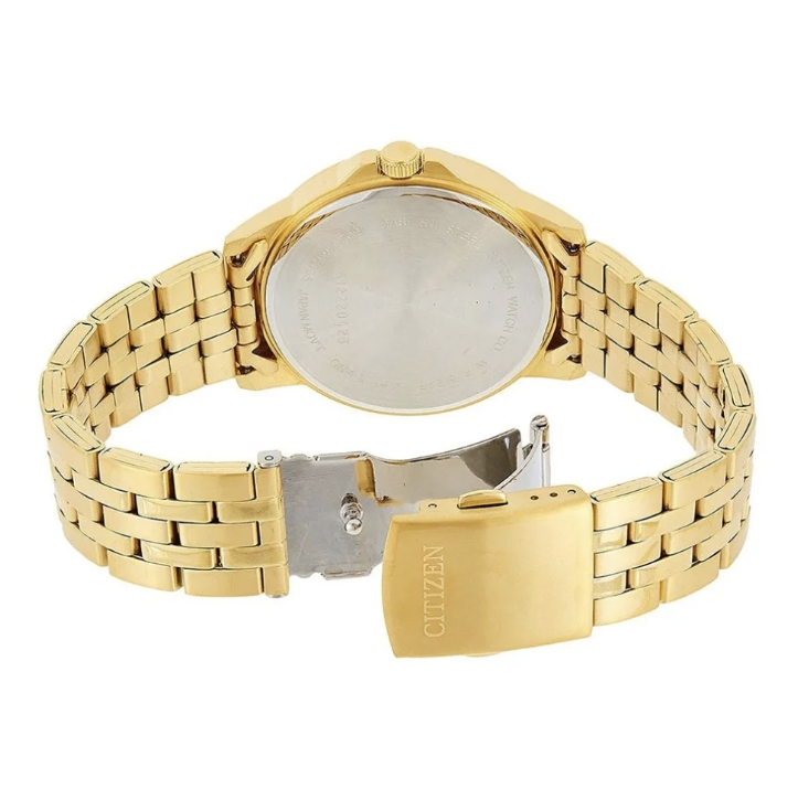 Citizen Elegance BF2013-56PE to kwarcowy zegarek męski, należący do znanej i cenionej japońskiej marki – Citizen. Ten niezwykle elegancki czasomierz, posiada tarczę w kolorze złotym, na której widnieje multidatownik, na wysokości godziny trzeciej. Zarówno koperta, jak i bransoleta tego ekskluzywnego zegarka, są wykonane z wysokiej jakości stali szlachetnej, w złotym kolorze. Citizen Elegance BF2013-56PE posiada mineralne, odporne na uderzenia szkiełko oraz wodoszczelność na poziomie 50m. Chroni to czasomierz przed uszkodzeniem, w wyniku ewentualnego zachlapania bądź zamoczenia. Męski zegarek na bransolecie to doskonały dodatek do każdej eleganckiej i zarazem odważnej stylizacji.