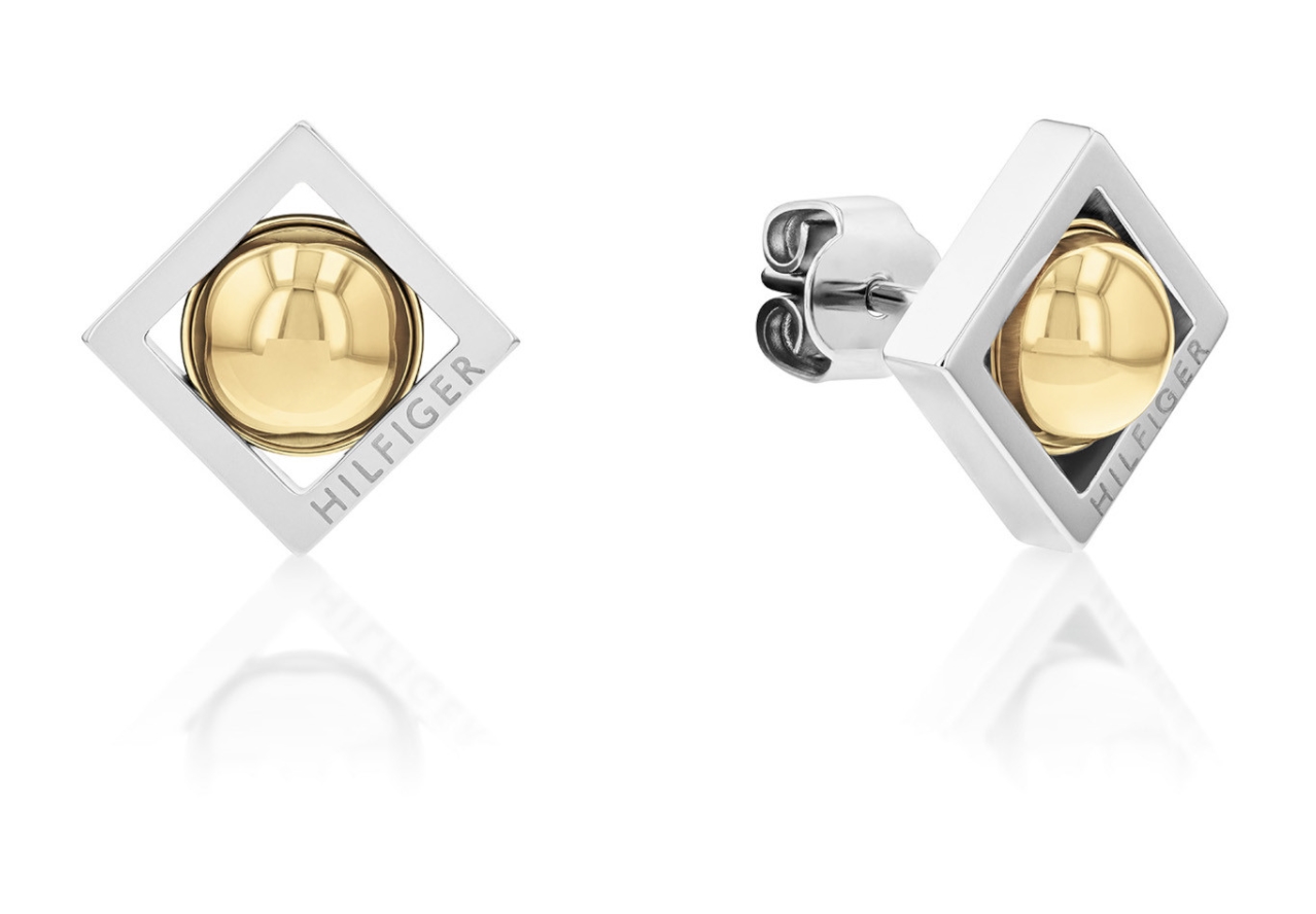 Kolczyki TOMMY HILFIGER 2780791 - stylowe kolczyki ze stali szlachetnej, w geometrycznym kształcie, ozdobione pozłacaną kulką i napisem: ,,HILFIGER”. Modne kolczyki na sztyft, wspaniale prezentują się na uchu, dodając casualowej stylizacji charakteru i blasku. Oryginalne kolczyki są bardzo praktyczne i wygodne. Szerokość stalowych kolczyków wynosi 8,5mm. Markowa biżuteria Tommy Hilfiger jest pakowana w oryginalne pudełko i torebkę. Świetnie nadaje się do wręczenia na prezent dla bliskiej osoby z okazji urodzin, rocznicy, na Dzień Kobiet itp.