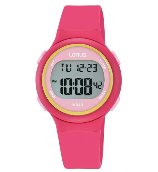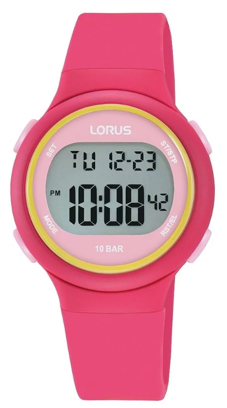 Lorus R2341QX9 to cyfrowy zegarek o sportowym charakterze, idealny dla aktywnych użytkowników. Wyposażony jest w mechanizm kwarcowy (kaliber Z027), który zapewnia precyzyjne działanie. Koperta z tworzywa sztucznego ma średnicę 32 mm, a różowy silikonowy pasek dodaje mu młodzieżowego stylu. Zegarek oferuje wiele funkcji: chronograf, alarm, podwójny czas, timer, datownik (dzień, miesiąc, rok), tryb 12/24 h oraz podświetlenie EL. Wodoszczelność na poziomie 100 m (10 ATM) pozwala na swobodne użytkowanie podczas pływania.