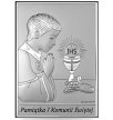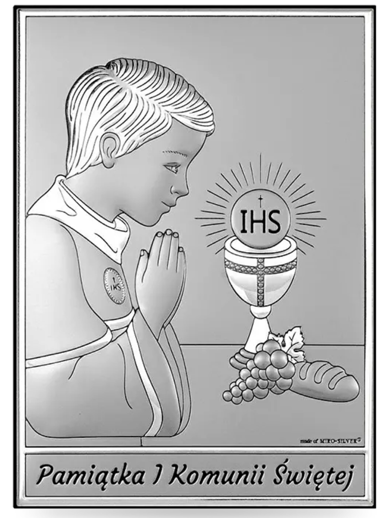 OBRAZEK CHŁOPIEC I KOMUNIA ŚW. 6795/2XO 9X13 - prostokątny obrazek komunijny z wizerunkiem chłopca, opatrzony napisem: ,,Pamiątka I Komunii Świętej”. Model nadaje się do postawienia bądź powieszenia na ścianie. Obrazek wykonała włoska firma Beltrami z wysokogatunkowego srebra, zabezpieczonego przed ciemnieniem i osadzonego na drewnianej podstawie. Pamiątka Komunii posiada firmowe pudełko i stopkę w zestawie. Do modelu istnieje możliwość zamówienia grawerunku na blaszce, montowanej z tyłu obrazka.