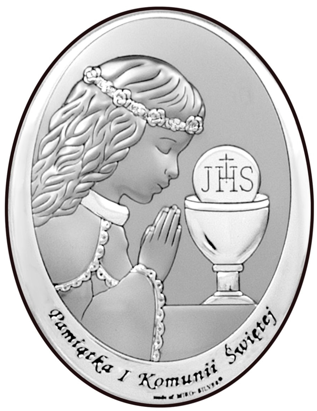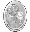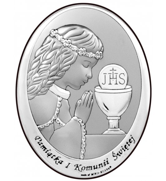 OBRAZEK DZIEWCZYNKA I KOMUNIA ŚW. 6571/3XA 13X18 – owalny obrazek, przedstawiający wizerunek pogrążonej w modlitwie dziewczynki, przystępującej do I Komunii Świętej, opatrzony napisem: ,,Pamiątka I Komunii Świętej”. Model został wykonany z wysokogatunkowego srebra, pokrytego zabezpieczającym przed śniedzią lakierem. Całość osadzona została na barwionym na brązowo drewnie. Do pamiątki Komunii dodawane jest firmowe pudełko oraz stopka do postawienia obrazka na dziecięcej półce. Istnieje możliwość zamówienia specjalnej dedykacji w postaci blaszki z grawerunkiem, wykonanym laserowo, montowanej do rewersu pamiątki.