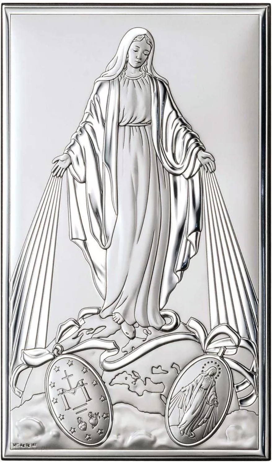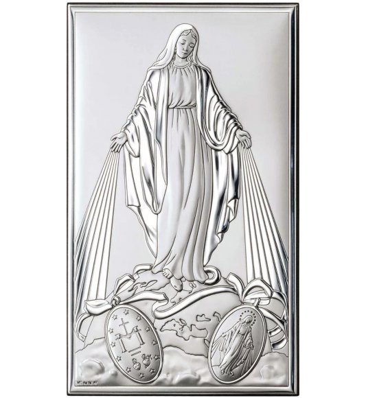 OBRAZEK MATKA BOSKA VL81322/3XL 9X15 – prostokątny obrazek, przedstawiający wizerunek Matki Boskiej Niepokalanej. Model pokryto wysokiej próby srebrem 925 metodą PVD i zabezpieczono przed śniedzią i ciemnieniem, bezbarwnym lakierem. Srebrna pamiątka nadaje się do wręczenia na prezent z okazji Bierzmowania, I Komunii Św., czy np. z okazji przyjęcia Święceń Kapłańskich. Model nadaje się do postawienia na półce, na dołączonej do zestawu podpórce, można go także powiesić na ścianie. Srebrna pamiątka jest pakowana w oryginalne pudełko, włoskiego producenta Valenti. Można do niej domówić spersonalizowany grawerunek, który wykonujemy na eleganckiej blaszce, montowanej z tyłu obrazka, do drewnianego panelu.