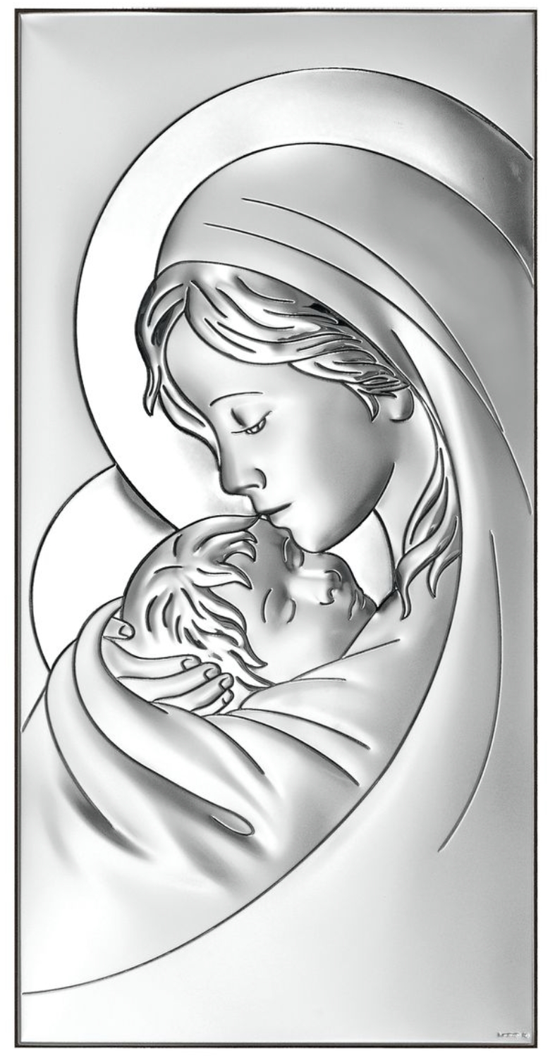 Obrazek przedstawiający wizerunek Matki Boskiej z Dzieciątkiem, w kształcie prostokąta. Model wykonano z aluminium pokrytego warstwą wysokogatunkowego srebra próby 925, które zostało zabezpieczone przed rdzą za pomocą specjalnego lakieru. Całość osadzono na drewnianej podstawie, w kolorze brązu. Obrazek może być wręczony jako pamiątka z okazji zawarcia związku małżeńskiego, Komunii, czy m.in. Chrztu. Pamiątka posiada w zestawie stopkę i oryginalne, firmowe pudełko, włoskiego producenta Beltrami. Istnieje możliwość wykonania grawerunku na eleganckiej blaszce, montowanej z tyłu modelu.