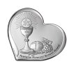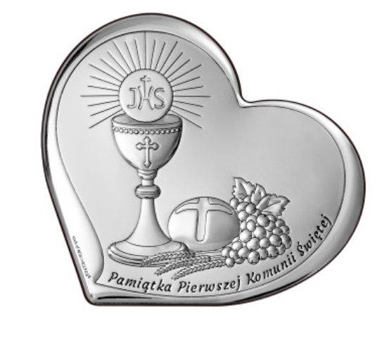 OBRAZEK PAMIĄTKA I KOMUNII ŚW. 6755S/3 15X14 – srebrny obrazek w kształcie serca, opatrzony napisem: ,,Pamiątka Pierwszej Komunii Świętej”. Elegancka pamiątka została pokryta srebrem wysokiej próby i zabezpieczona przed szkodliwym działaniem otoczenia. Model nie ciemnieje i cieszy oko właściciela przez długie lata. Pamiątkę komunijną można zarówno powiesić na ścianie, jak i postawić na dołączonej do zestawu podpórce. Do religijnego obrazka dodajemy oryginalne opakowanie włoskiego producenta, a na specjalne zamówienie wykonujemy grawerunek na blaszce, montowanej do rewersu.
