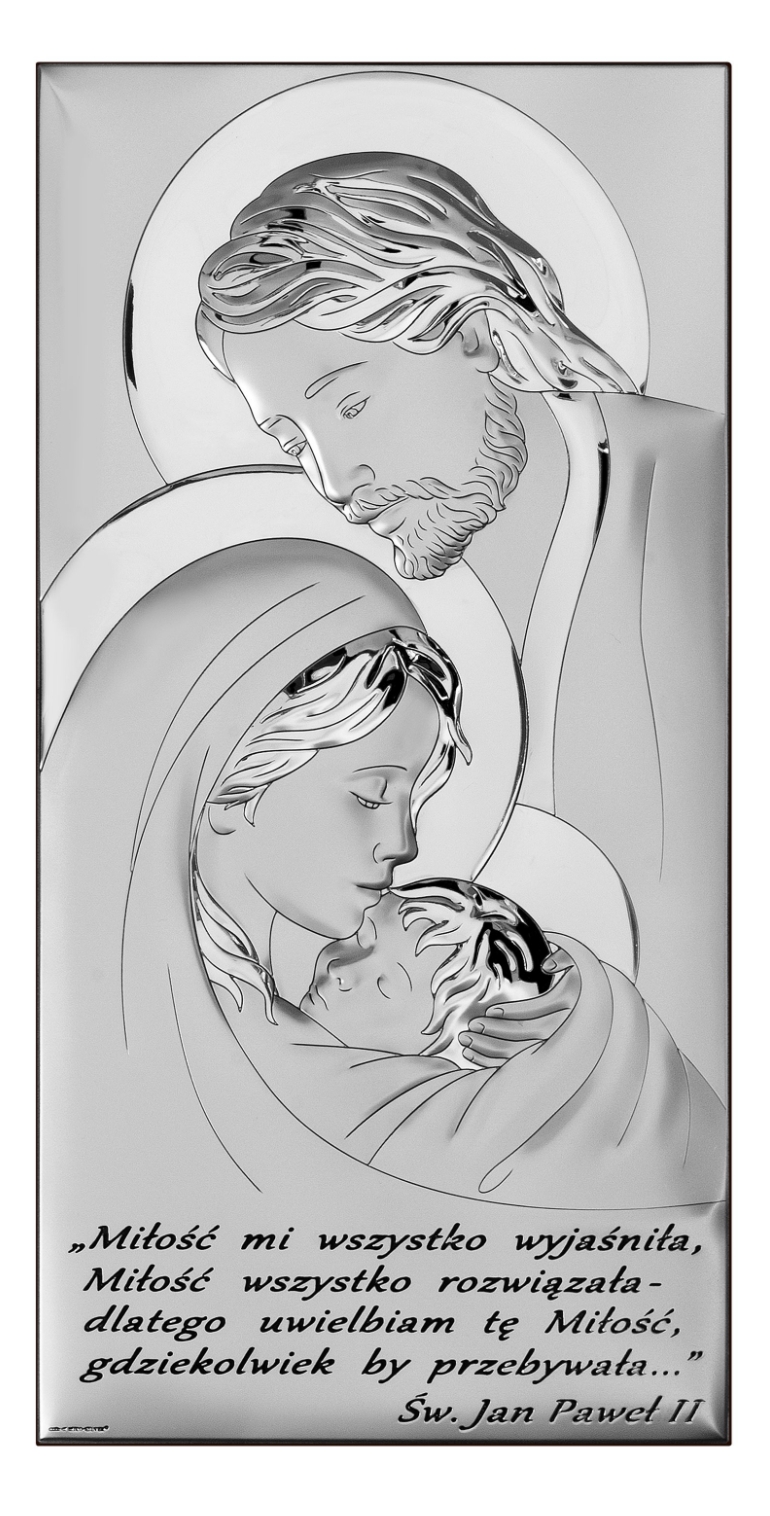 Nasz sklep oferuje szeroki wybór srebrnych pamiątek, nawiązujących do tradycji chrześcijańskiej i związanej z nią obrzędów i sakramentów. Nasz asortyment obejmuje m.in. obrazy, które przedstawiają wizerunek Świętej Rodziny, będącej symbolem rodzinnego ciepła, miłości i wzajemnego szacunku. Srebrny obrazek przedstawiający kochającą rodzinę: Maryję, Józefa i Dzieciątko Jezus to idealny prezent dla nowożeńców, z okazji rozpoczęcia nowej drogi życia, ofiarowany najczęściej przez rodziców bądź chrzestnych.