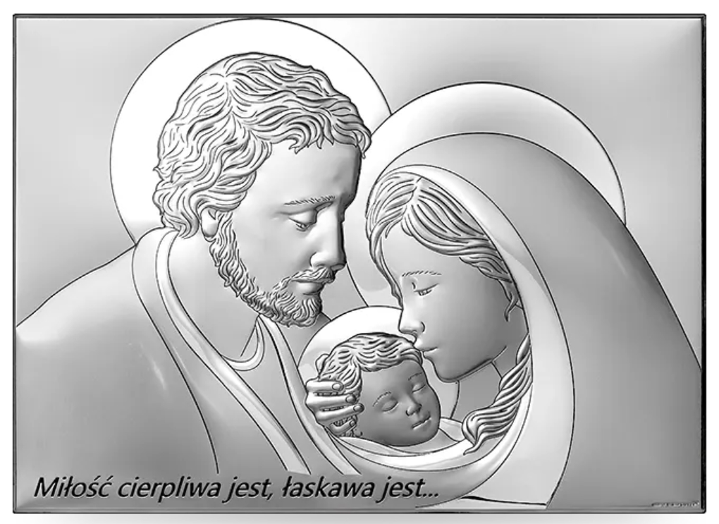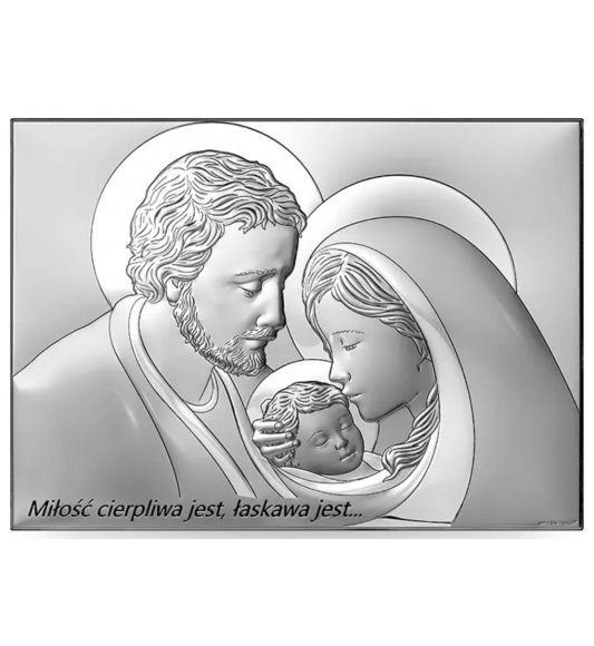 OBRAZEK ŚWIĘTA RODZINA 6745/3 17X23 - prostokątny obrazek, przedstawiający wizerunek Świętej Rodziny, opatrzony napisem: ,,Miłość cierpliwa jest, łaskawa jest...”. Obraz przedstawiający Świętą Rodzinę nadaje się doskonale do wręczenia na prezent z okazji Ślubu, czy jego rocznicy. Model symbolizuje ciepło domowego ogniska, wzajemną miłość i szacunek, dlatego warto mieć go w zaciszu swojego domu. Srebrny obraz można postawić, dzięki obecnej w zestawie stopce lub powiesić na ścianie. Za sprawą nowoczesnej technologii wykonania obrazek będzie zachwycał swym pięknem przez długie lata. Metalowa forma została równomiernie pokryta wysokogatunkowym srebrem próby 999,95% i zabezpieczona przed śniedzią lakierem. Całość osadzona została na panelu z barwionego na brązowo drewna. Do pamiątki Ślubu dodajemy firmowe pudełko oraz na specjalne zamówienie blaszkę z grawerunkiem.