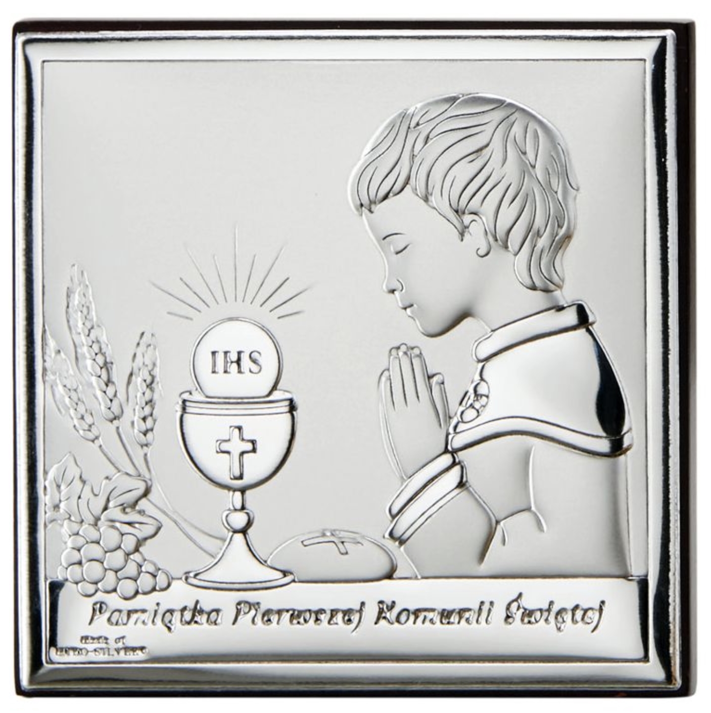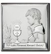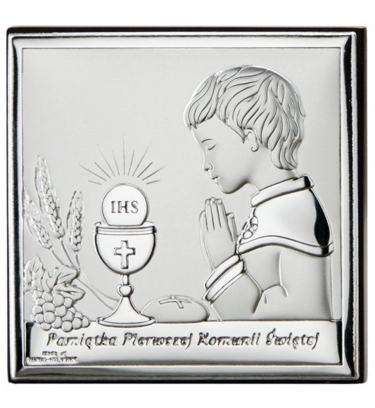 OBRAZEK CHŁOPIEC I KOMUNIA ŚW. VL842/4L 12X12 – pamiątka I Komunii Świętej, w kształcie kwadratu, nadająca się do wręczenia na prezent dla chłopca. Model opatrzono napisem: ,,Pamiątka Pierwszej Komunii Świętej” i wykonano przy użyciu nowatorskiej technologii Mirosilver, z aluminiowej formy, pokrytej wysokiej próby srebrem. Dla zachowania estetycznego wyglądu i w celu zabezpieczenia przed ciemnieniem, pamiątkę komunijną pokryto bezbarwnym lakierem. Srebrny obrazek z wizerunkiem chłopca nadaje się do powieszenia na ścianie i postawienia na dołączonej do modelu stopce. Do komunijnej pamiątki dodawane jest firmowe pudełko i na życzenie klienta również blaszka z wybraną dedykacją, montowana do rewersu srebrnego obrazka.