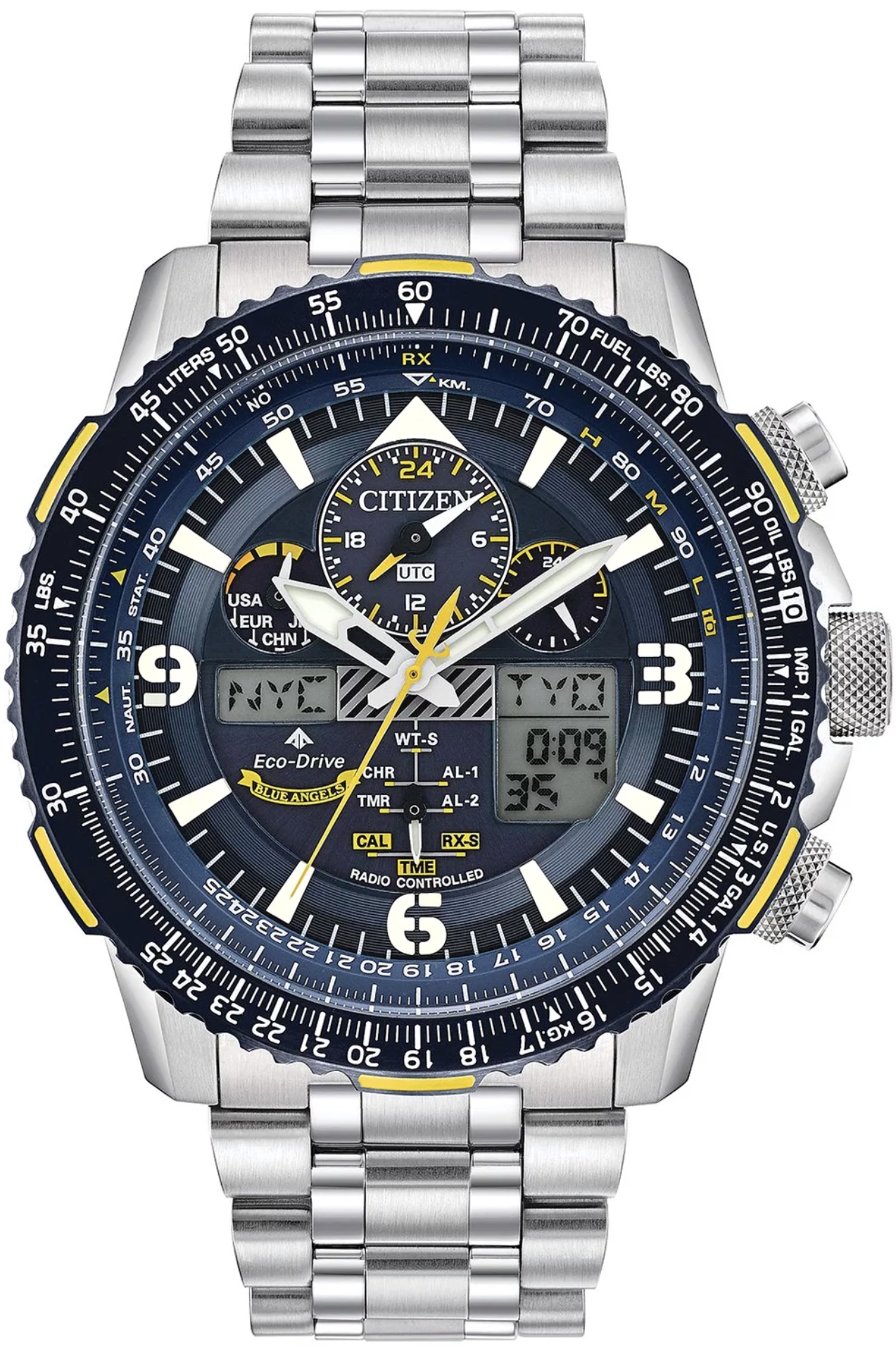Zegarek Citizen Promaster Skyhawk A-T Blue Angels JY8078-52L to doskonały wybór na prezent na Walentynki dla fanów aktywnego stylu życia. Srebrna bransoleta i koperta tworzą udaną kompozycję z granatową tarczą, na której umieszczone są kontrastujące, żółte elementy.
