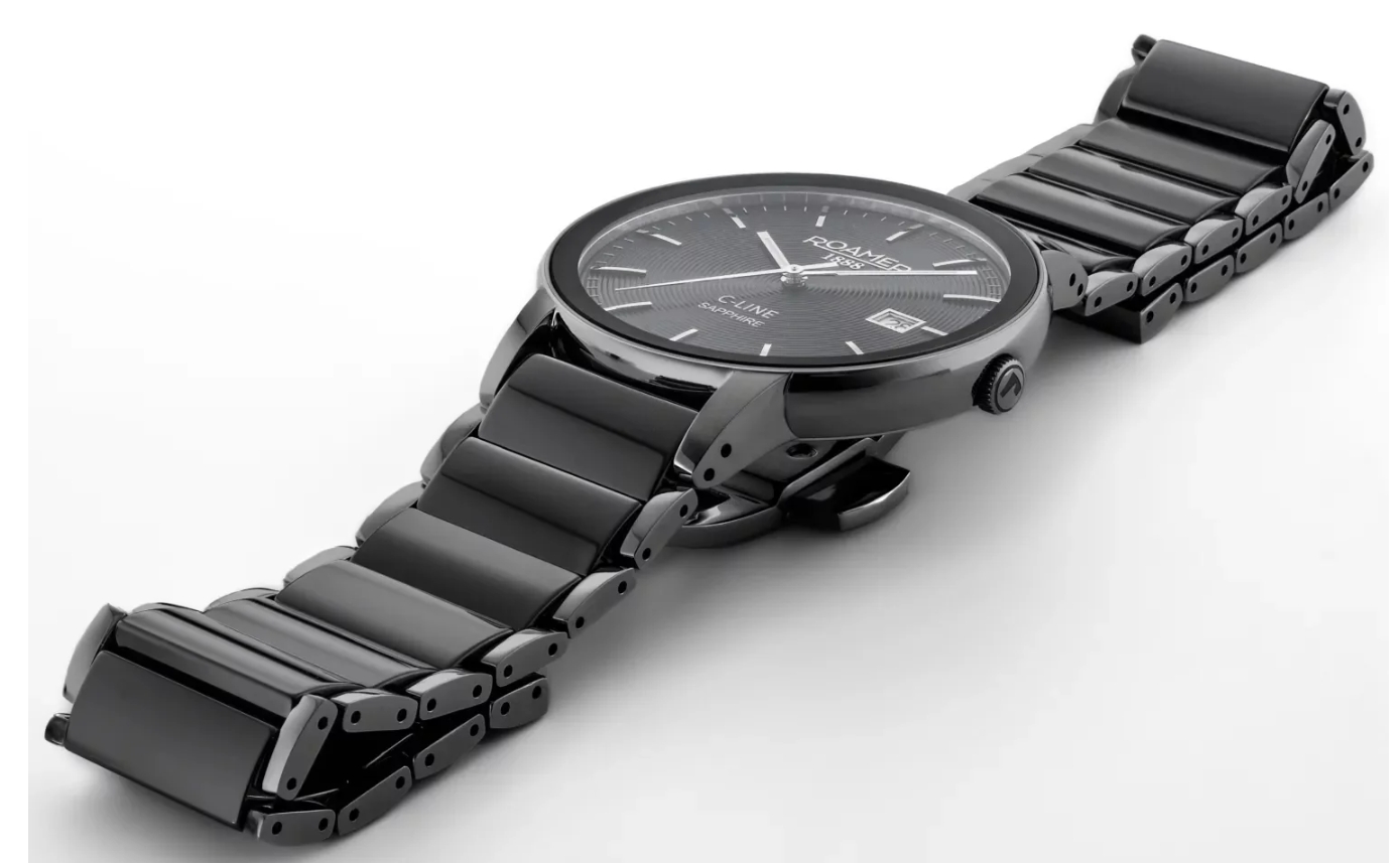 Roamer C-Line Ceramic 997833 44 85 20 to elegancki męski zegarek, który wyróżnia się nowoczesnym designem i zastosowaniem ceramiki – materiału odpornego na zarysowania i nadającego luksusowy połysk. Stalowa koperta w połączeniu z ceramiczną bransoletą tworzy harmonijną, stylową całość. Zegarek napędzany jest dokładnym mechanizmem kwarcowym, a szafirowe szkło chroni tarczę przed uszkodzeniami. Dzięki wodoszczelności 50 m sprawdzi się w codziennym użytkowaniu, zachowując przy tym elegancki charakter.