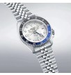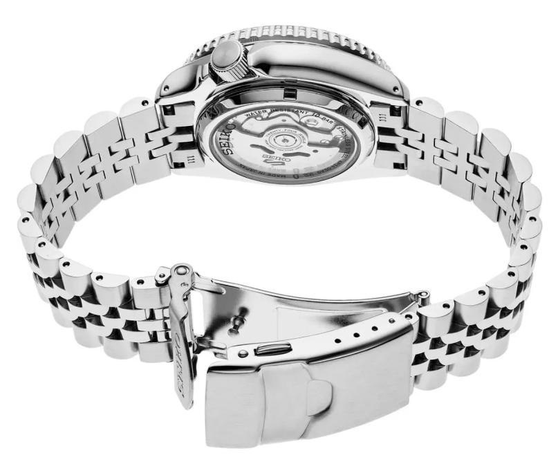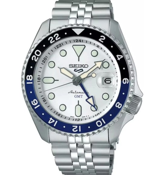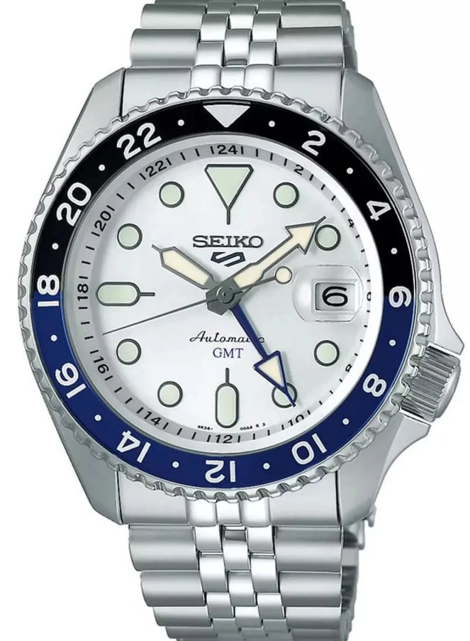 Seiko 5 Sports Automatic GMT SSK033K1 to sportowy model z serii SKX, wyposażony w automatyczny mechanizm 4R34 z funkcją GMT, która pozwala śledzić drugi czas dzięki dodatkowej 24‑godzinnej wskazówce. Zegarek wyróżnia się białą tarczą, wyrazistymi indeksami i charakterystycznym czarno‑niebieskim bezelem typu „Batman”, co nadaje mu dynamiczny, nowoczesny wygląd. Stalowa koperta i bransoleta zapewniają trwałość, a wodoszczelność 100 m sprawia, że nadaje się do codziennej aktywności. Transparentny dekiel pozwala podziwiać pracę mechanizmu, a datownik na godzinie 3 zwiększa praktyczność.