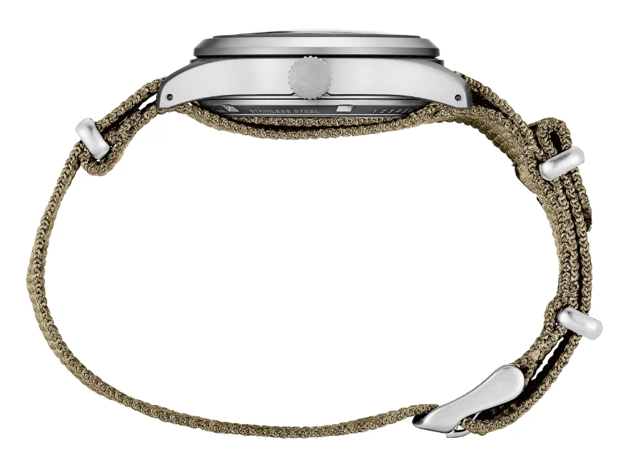 - Matowa koperta ze stali, pasek z materiału tekstylnego w kolorze brązowym/piaskowym