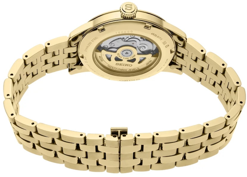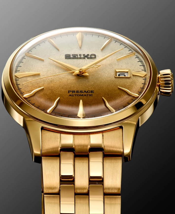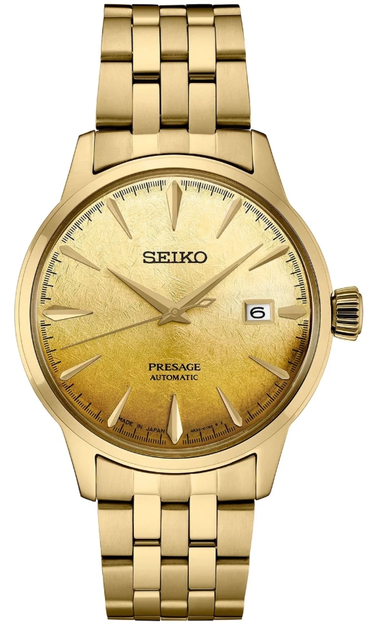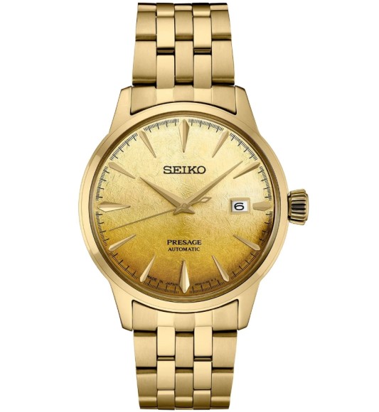 Seiko Presage Cocktail Time Beer Jupel SRPK46J1 to elegancki, automatyczny zegarek inspirowany koktajlami piwnymi, wyróżniający się tarczą o stopniowanej, złotej kolorystyce oraz pełnym złotym wykończeniem koperty i bransolety. Model wykorzystuje mechanizm automatyczny i zachowuje charakterystyczny dla linii Presage styl – połączenie klasyki, finezyjnych detali i wysokiej jakości wykonania. Złota tarcza, stalowa bransoleta oraz szkło szafirowe nadają mu wyrafinowany, wieczorowy charakter, a wodoszczelność 100 m zapewnia praktyczność w codziennym użytkowaniu.