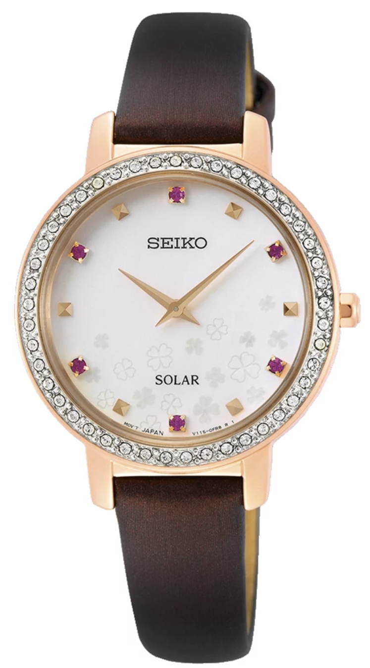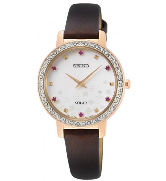Seiko Solar Lady SUP450P1 - to damski zegarek, należący do cenionej na świecie, japońskiej marki - Seiko. Ten elegancki czasomierz opiera się na kwarcowym mechanizmie, ładującym się solarnie, za pomocą energii ze światła sztucznego i naturalnego. Model posiada okrągłą kopertę z różowo-złotej stali szlachetnej, której towarzyszy brązowy pasek z tworzywa sztucznego. Na jasnej tarczy japońskiego zegarka widnieje kwiatkowy wzór oraz złote wskazówki i indeksy godzinowe w postaci kwadracików przeplatanych różowymi kryształkami. Pierścień koperty został pokryty błyszczącymi jasnymi kamyczkami, które dodają czasomierzowi dziewczęcego uroku. Biżuteryjny zegarek na pasku podkreśli piękno każdej odświętnej stylizacji. Zegarek wyposażono w mineralne, odporne na stłuczenia szkiełko i wodoszczelność 30m, która chroni model przed zachlapaniem. Solarny damski zegarek to zawsze dobry wybór dla kobiet, które nie chcą sobie zawracać głowy częstą wymianą baterii. Czasomierz ładowany światłem to praktyczny model, który z pewnością przypadnie do gustu niejednej nowoczesnej kobiecie.