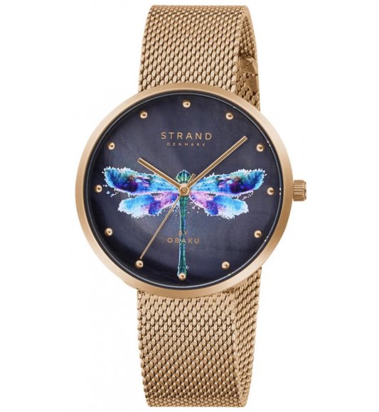 Strand S700LXVBMV-DD - to damski kwarcowy zegarek, należący do znanej, duńskiej marki - Strand. Ten elegancki czasomierz posiada okrągłą kopertę i siatkową, ozdobną bransoletkę, wykonane z wytrzymałego metalu, pokrytego różowym złotem. Na ciemnej, granatowej tarczy umieszczone zostały proste wskazówki i indeksy godzinowe w postaci kropek oraz widowiskowy motyw ważki. Zegarek na bransolecie marki Strand posiada mineralne, odporne na uderzenia szkiełko i podstawowy poziom wodoszczelności - 30m, która chroni model przed zachlapaniem. Kobiecy zegarek Strand doskonale prezentuje się na damskim nadgarstku zarówno w obecności odświętnej, jak i casualowej stylizacji. Model cieszy się popularnością za sprawą dobrej ceny i ciekawej stylistyki.