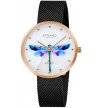- Perłowa tarcza zdobiona wizerunkiem wielobarwnej ważki, indeksy godzinowe z subtelnych kropek