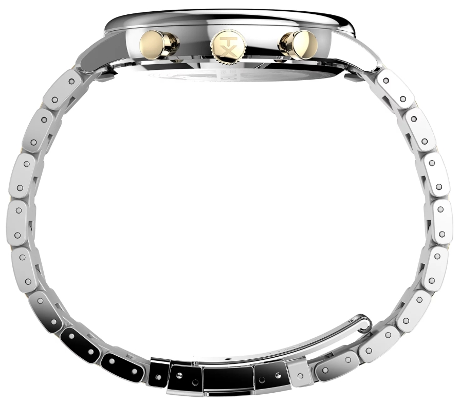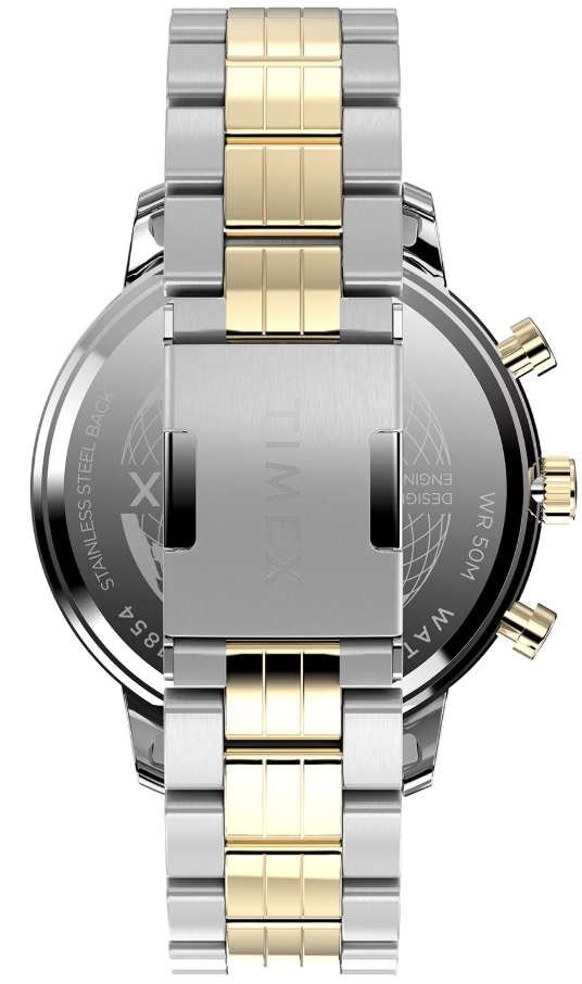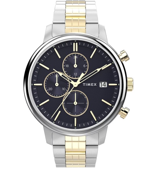 Timex TW2W13300 to elegancki męski chronograf z serii Chicago, wyróżniający się dwukolorową stalową bransoletą, czarną giloszowaną tarczą i solidną kopertą 45 mm. To model łączący klasyczny wygląd z praktycznymi funkcjami, takimi jak stoper, czas 24h i datownik.
