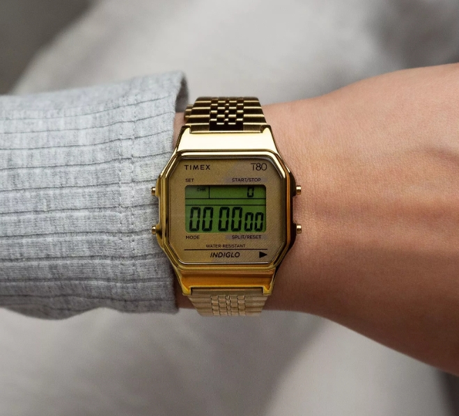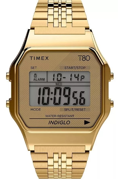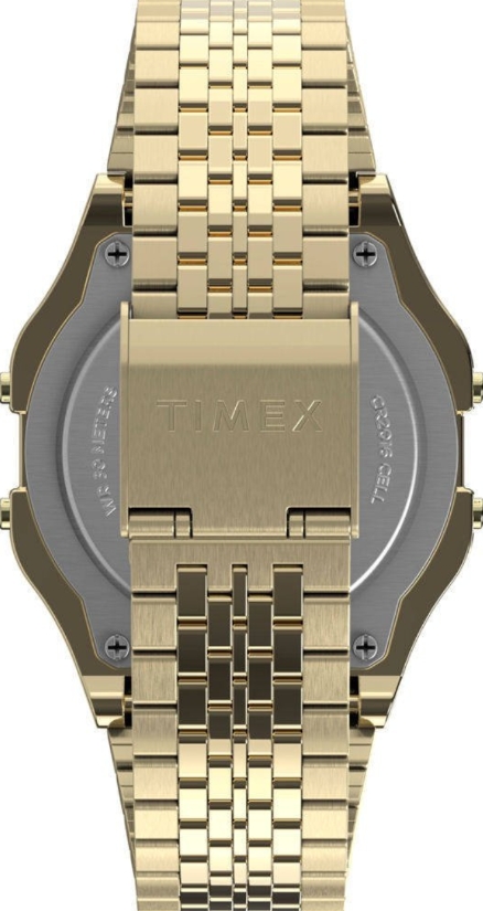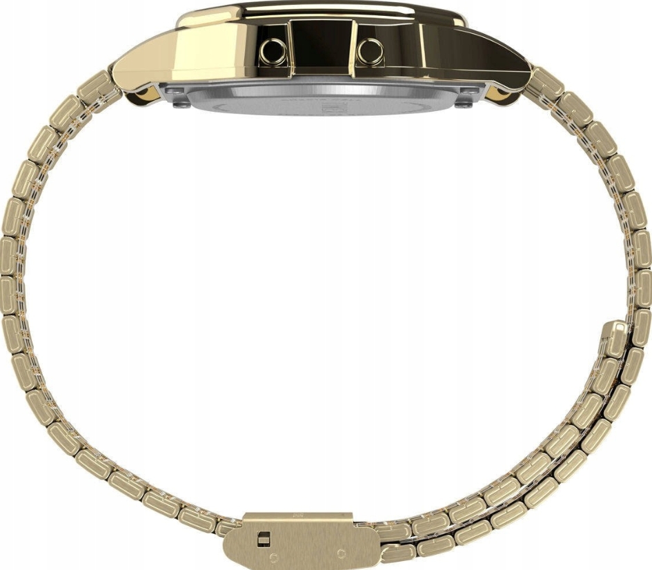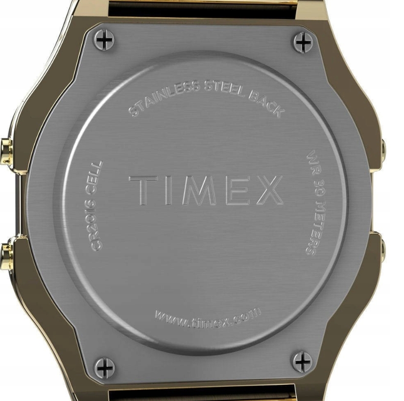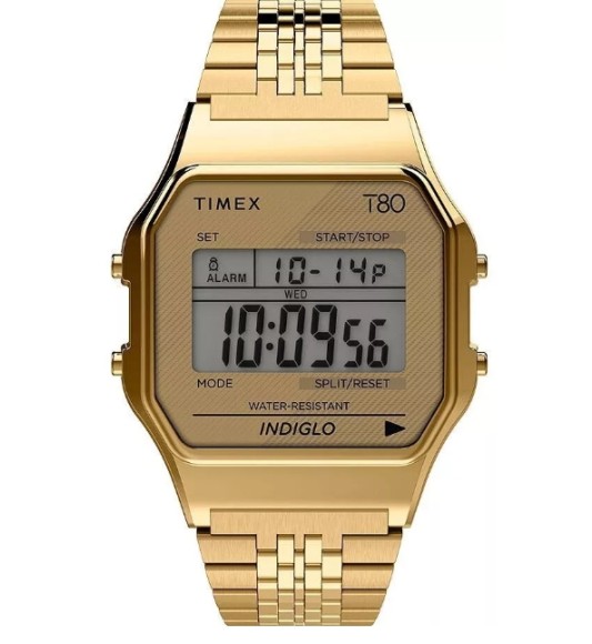 Zegarek Timex TW2R79200 to stylowy model z linii Timex T80, który nawiązuje do estetyki lat 80. Posiada prostokątną, złotą kopertę wykonaną z tworzywa sztucznego oraz dopasowaną złotą bransoletę ze stali nierdzewnej. Wyposażony jest w cyfrowy wyświetlacz, funkcje takie jak alarm, stoper, datownik oraz charakterystyczne podświetlenie Indiglo, które zapewnia czytelność w ciemności. Mechanizm kwarcowy gwarantuje precyzyjne działanie, a wodoszczelność na poziomie 30 metrów chroni przed zachlapaniem. Ten model łączy retro wygląd z praktycznymi funkcjami, idealny dla osób ceniących klasykę w nowoczesnym wydaniu.