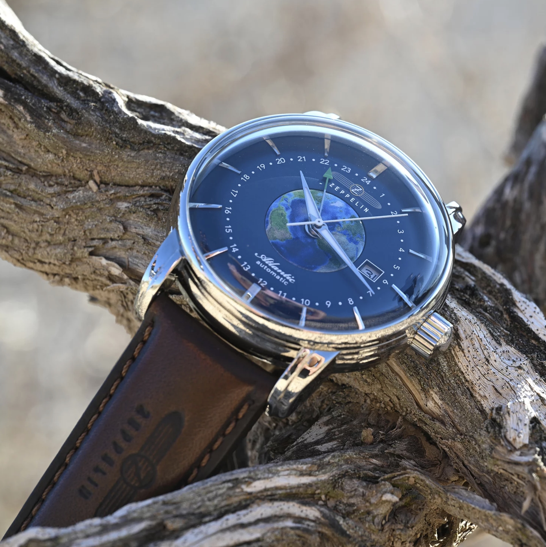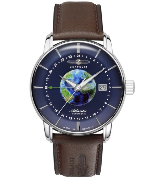 Zeppelin Atlantic Automatik GMT 8468-3 – męski zegarek, należący do cenionej, niemieckiej marki – Zeppelin. Automatyczny czasomierz opiera się na japońskim mechanizmie – Miyota 9075, ładowanym ruchem nadgarstka właściciela. Ekskluzywny zegarek doda blasku i niepowtarzalnego charakteru każdej męskiej stylizacji. Model posiada okrągłą, stalową kopertę i brązowy pasek z naturalnej skóry. Na granatowej tarczy automatycznego Zeppelina, umieszczono fluoroscencyjne wskazówki i indeksy godzinowe, w postaci kresek, datownik na godzinie trzeciej oraz w samym centrum - wizerunek kuli ziemskiej. Zegarek w stylu pilot/ awiator ma przeszklony dekiel oraz funkcję wyświetlania czasu światowego i GMT. Elegancki czasomikerz ma mineralne, odporne na uderzenia szkiełko i wodoodporność 50m, która chroni model przed zachlapaniem i umożliwia pływanie powierzchniowe.